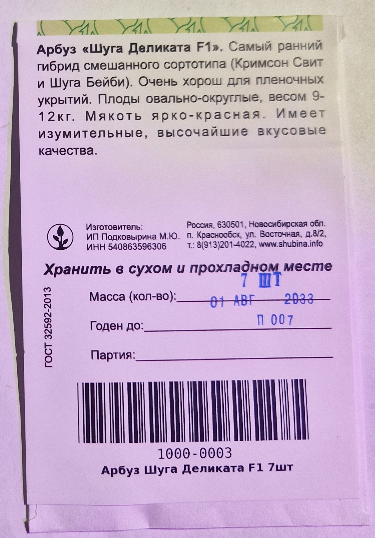 Самый ранний гибрид смешанного сортотипа (Кримсон Свит и Шуга Бейби). Очень хорош для пленочных укрытий. Плоды овально-округлые, весом 9-12кг. Мякоть ярко-красная. Имеет изумительные, высочайшие вкусовые качества.
