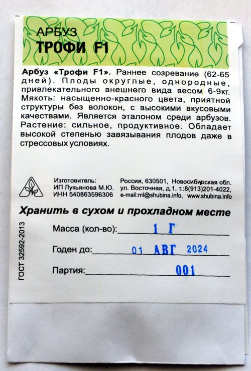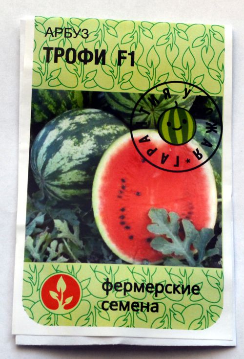 Арбуз Трофи F1. Раннее созревание (62-65 дней). Плоды округлые, однородные, привлекательного внешнего вида весом 6-9кг. Мякоть: насыщенно-красного цвета, приятной структуры без волокон, с высокими вкусовыми качествами. Является эталоном среди арбузов. Растение: сильное, продуктивное. Обладает высокой степенью завязывания плодов даже в стрессовых условиях.