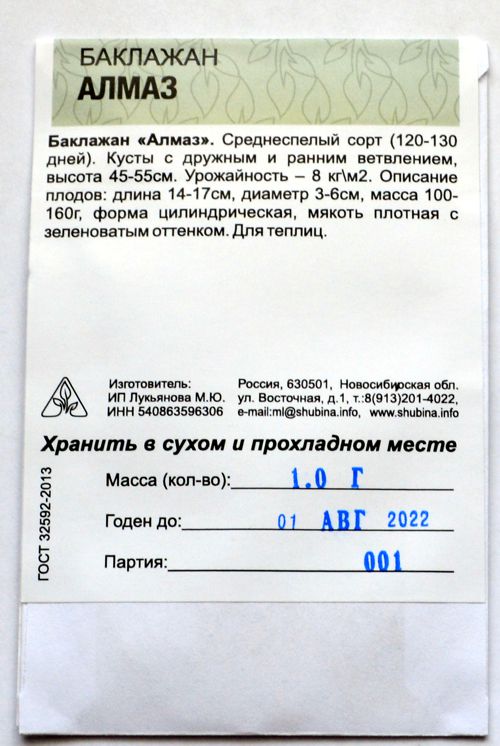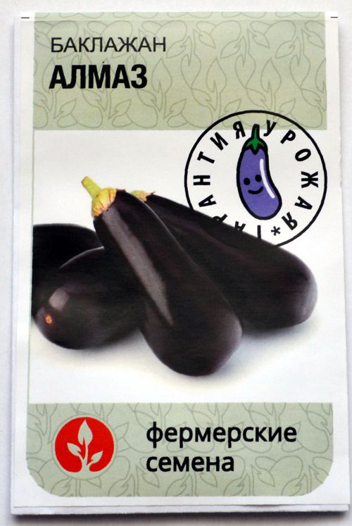 Баклажан Алмаз. Среднеспелый сорт (120-130 дней). Кусты с дружным и ранним ветвлением, высота 45-55см. Урожайность – 8 кг\м2. Описание плодов: длина 14-17см, диаметр 3-6см, масса 100-160г, форма цилиндрическая, мякоть плотная с зеленоватым оттенком. Для теплиц.
