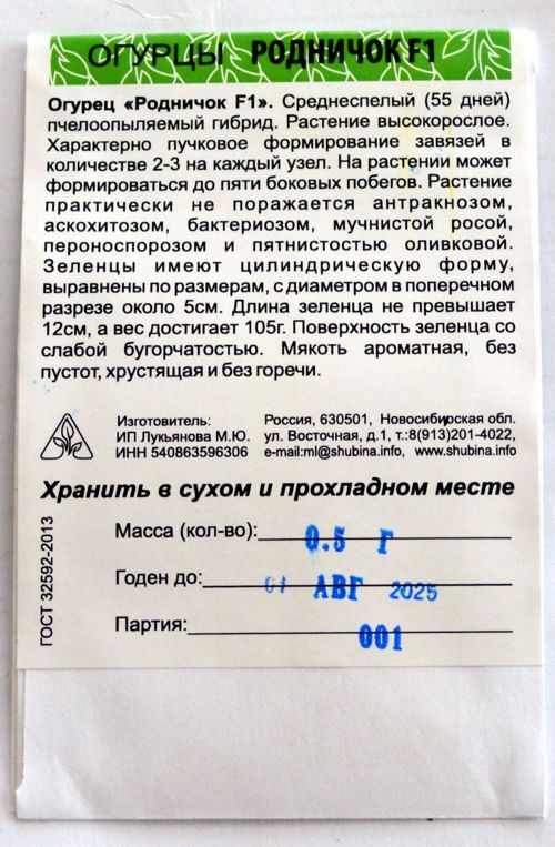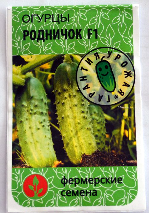 Огурец Родничок F1. Среднеспелый (55 дней) пчелоопыляемый гибрид. Растение высокорослое. Характерно пучковое формирование завязей в количестве 2-3 на каждый узел. На растении может формироваться до пяти боковых побегов. Растение практически не поражается антракнозом, аскохитозом, бактериозом, мучнистой росой, пероноспорозом и пятнистостью оливковой. Зеленцы имеют цилиндрическую форму, выравнены по размерам, с диаметром в поперечном разрезе около 5см. Длина зеленца не превышает 12см, а вес достигает 105г. Поверхность зеленца со слабой бугорчатостью. Мякоть ароматная, без пустот, хрустящая и без горечи.