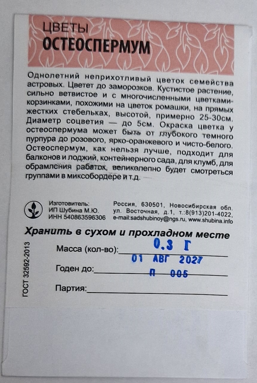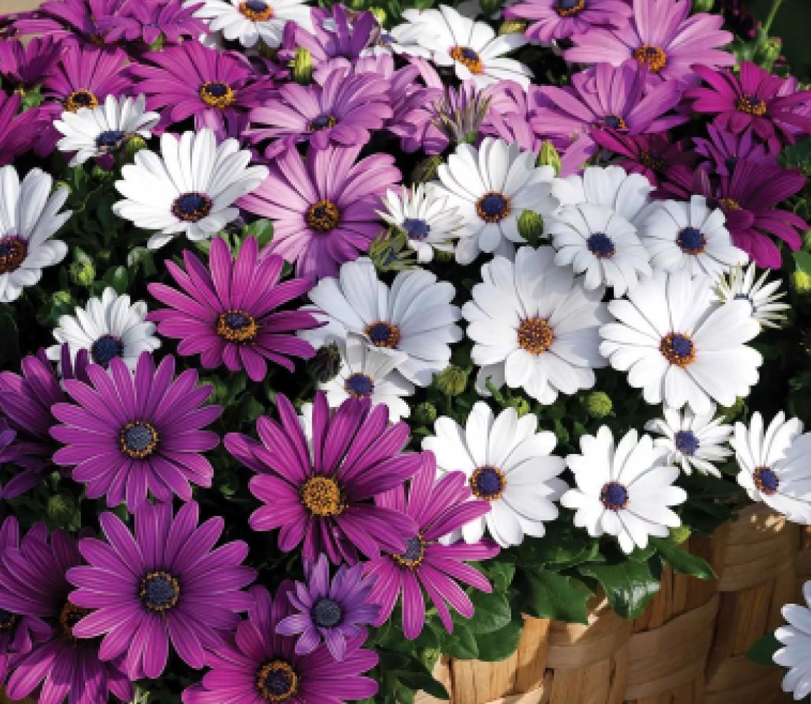 Однолетний неприхотливый цветок семейства астровых. Цветет до заморозков. Кустистое растение, сильно ветвистое и с многочисленными цветками-корзинками, похожими на цветок ромашки, на прямых жестких стебельках, высотой, примерно 25-30см. Диаметр соцветия — до 5см. Окраска цветка у остеоспермума может быть от глубокого темного пурпура до розового, ярко-оранжевого и чисто-белого. Остеоспермум, как нельзя лучше, подходит для балконов и лоджий, контейнерного сада, для клумб, для обрамления рабаток, великолепно будет смотреться группами в миксобордере и т.д.