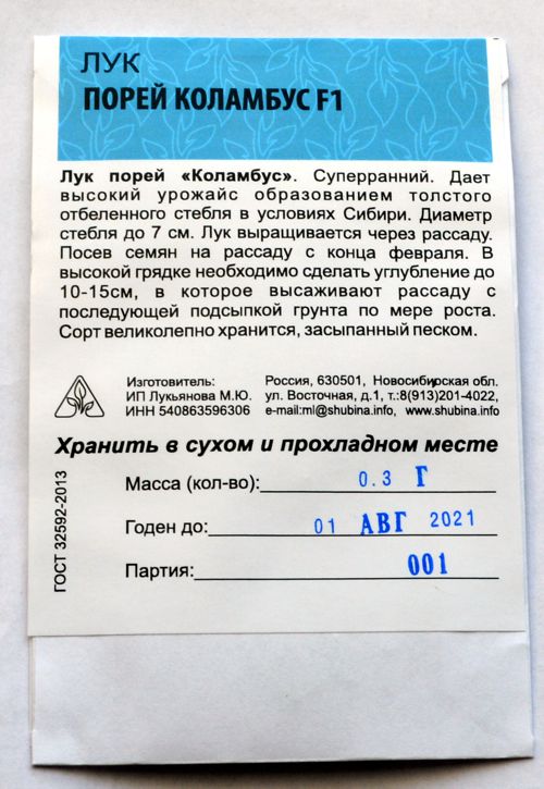 Лук порей Коламбус. Суперранний. Дает высокий урожай с образованием толстого отбеленного стебля в условиях Сибири. Диаметр стебля до 7 см. Лук выращивается через рассаду. Посев семян на рассаду с конца февраля. В высокой грядке необходимо сделать углубление до 10-15см, в которое высаживают рассаду с последующей подсыпкой грунта по мере роста. Сорт великолепно хранится, засыпанный песком.