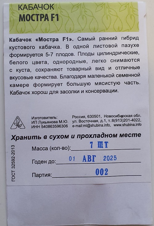 МОСТРА F1. Самый ранний гибрид кустового кабачка. В одной листовой пазухе формируется 5-7 плодов. Плоды цилиндрические, белого цвета, однородные, легко снимаются с куста, сохраняют товарный вид и отличные вкусовые качества. Благодаря маленькой семенной камере формирует большую мясистую часть. Кабачок хорош для засолки и консервации.